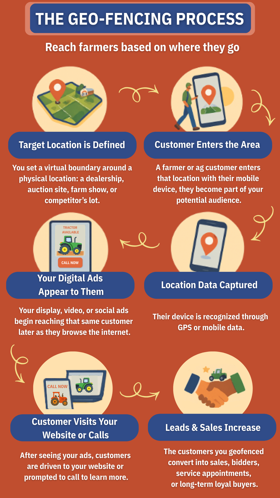 WHY IT WORKS FOR AG: Farmers and ag professionals spend much of their time on the road or at key locations like feed suppliers and equipment dealers. Geofencing lets you reach them exactly where they are, making it ideal for local promotions, product launches, or event awareness.Real-time mobile audience reach