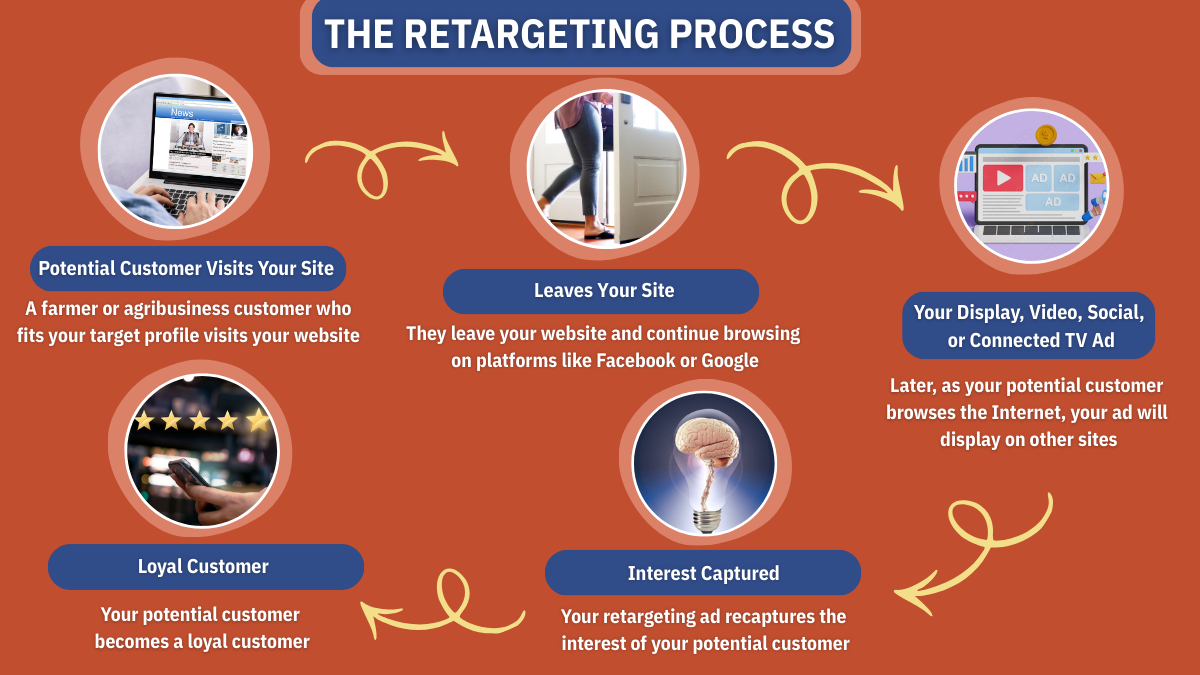 WHY IT WORKS FOR AG: Farm purchasing cycles are often long and research-heavy. A grower or equipment buyer may visit multiple times before making a decision. Retargeting keeps your brand in front of those high-value prospects, increasing recall and driving them back when they’re ready to purchase or book an appointment.